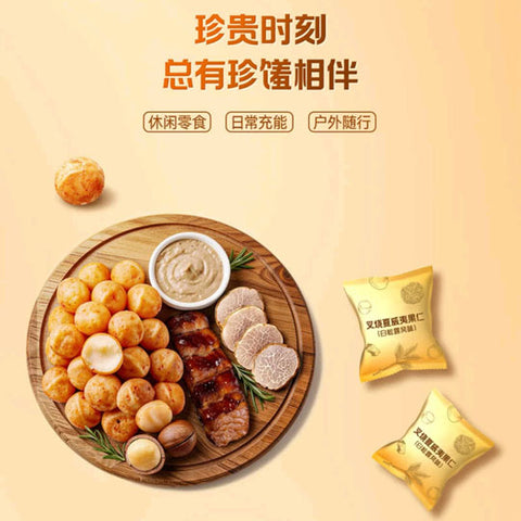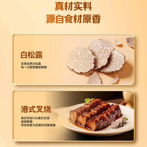配料表:进口夏威夷果仁(≥85%),港式叉烧(熟肉制品)(≥14%),又烧味复合调味料,白砂糖,麦芽糖浆,白松露酱(复合调味料)(实际以包装信息为准),每千克产品中添加白松露200mg