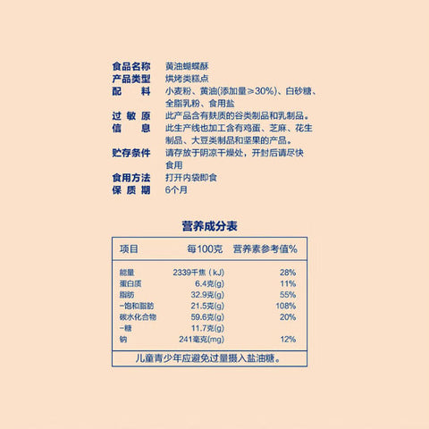 配料:小麦粉、黄油(添加量>30%)、白砂糖、全脂乳粉、食用盐